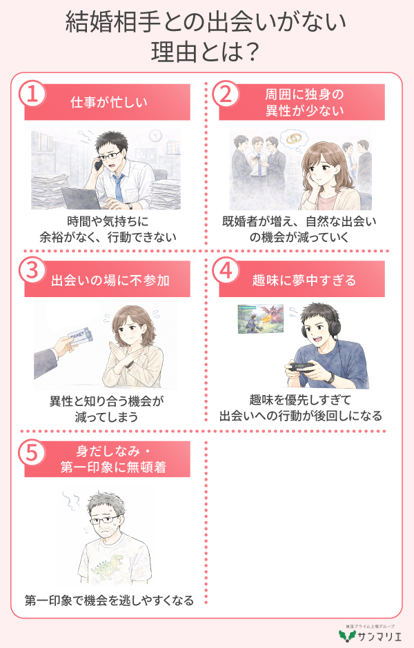 結婚相手との出会いがない主な理由は、以下のとおりです。