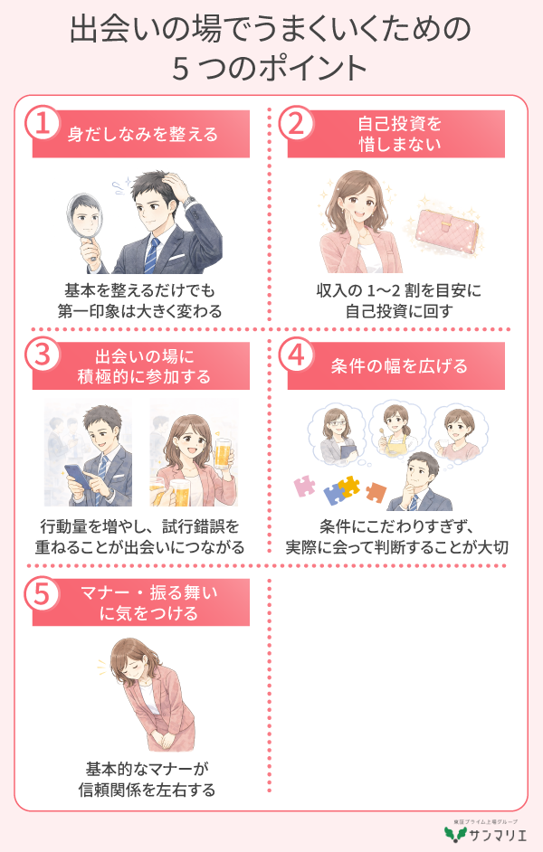 あわせて、いつ出会いが訪れてもよいように、日頃から身だしなみやコミュニケーションを意識し、自分磨きを続けていきましょう。
