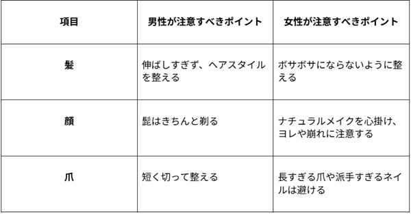 ここからは、男女別に意識しておきたい身だしなみのポイントを紹介します。