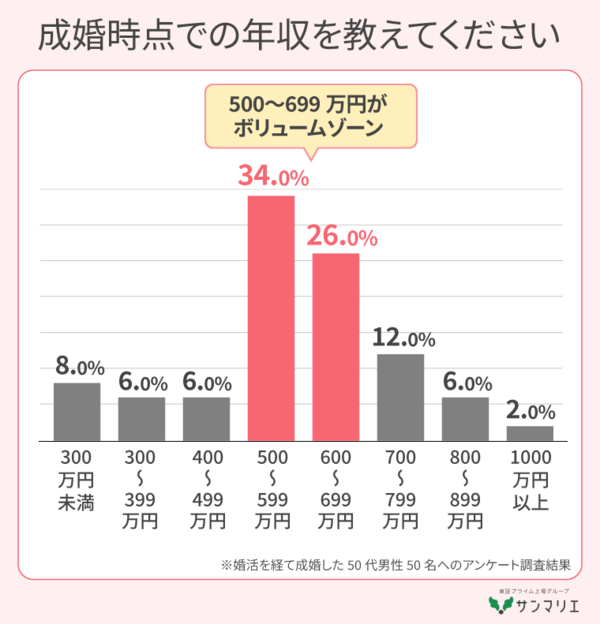 50代で婚活を経て成婚した男性の年収を調査したところ、以下のような結果となりました。