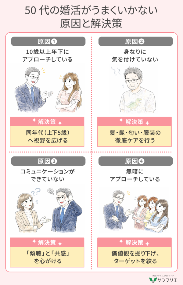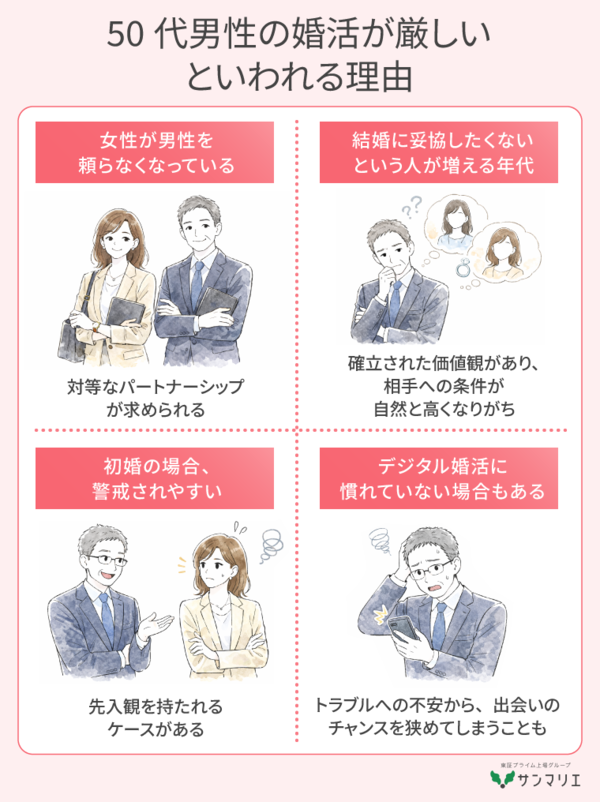 50代男性の婚活が厳しいといわれる理由として、以下が挙げられます。