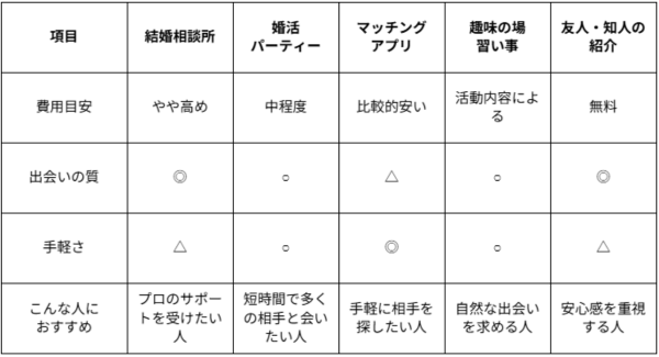 ここからは、以下の婚活手段別に50代男性が利用時に注意すべきポイントを整理しました。